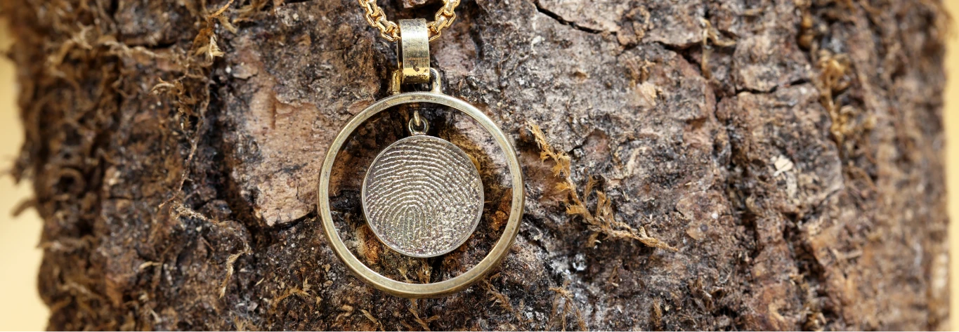 Für den Fingerprint wird ein Fingerabdruck des Verstorbenen in ein Schmuckstück eingearbeitet, das als Ring, Armband, Anhängers oder Kette getragen werden kann.