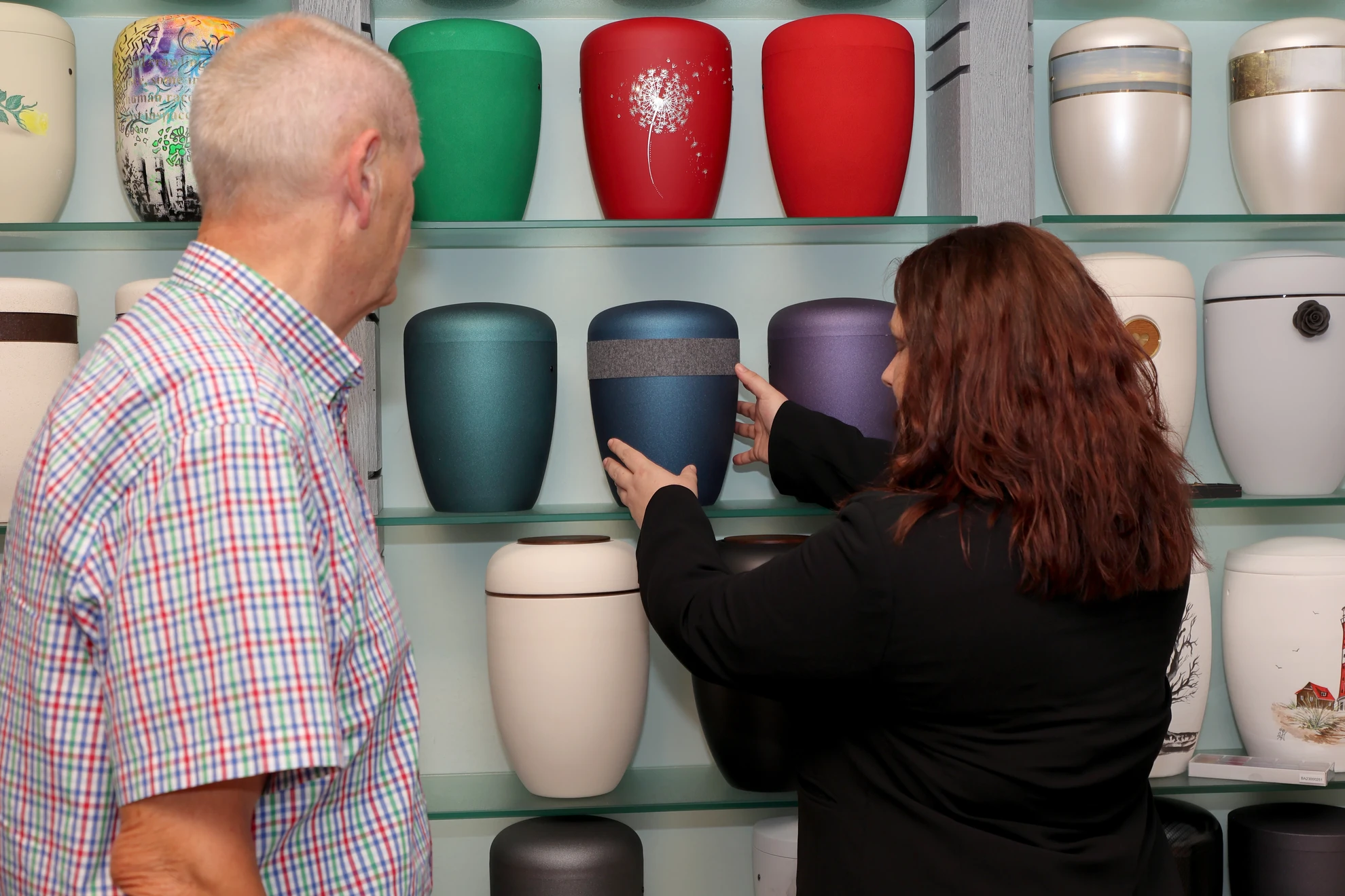 - Wir präsentieren ausgewählte Urnen, Särge und Deckengarnituren in unseren Ausstellungsräumen.